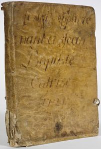 1721". In-8° (int. frais). Rel. de l'époque : plein parchemin de récupération, dos lisse, lacets de fermeture en peau (ex. de travail : part. dérelié, manque au bas du dos et au plat inf., cordons de fermetures absent ou cassés, taches...). Joli manuscrit, soigné, usant de rouge (jaune et vert vers la fin) pour les filets de soustraction ou de séparation de chapitre, les titres ou divers petits ornements. Avec tables de calculs et de multiplication, explication des multiplications, fractions, soustractions..., de règles de calcul (règle de 3, preuve par 9, règle d'intérêt à payer), exercices de change de monnaies, etc. Le tout accompagné de nombreuses question/ explication/ preuve. Table in fine.