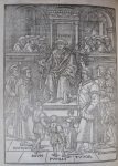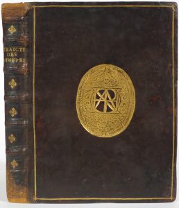 Anvers, Jean Bellère, 1567. Pet. in-4° : [14]-133-[19] ff. (mouill. claires marg., rares piqûres surtout aux 1ers ff., pet. taches au f. *4 v°, rares soulignages discrets à l'encre brune ou rouge, sinon ex. à belles marges). Rel. monogrammée de l'époque : plein veau, plaque centrale monogrammée dorée sur les plats cernés d'un filet doré, dos fleuronné doré à nerfs avec jeu de filets à froid croisés en tête et queue, doublures de papier blanc, gardes de parchemin (un mors fendu en tête, fines craquelures au dos, coiffes habilement restaurées mais cuir passé, coins et coupes lég. frottés). Édition originale de la traduction française du "Patrocinium pupillorum" (éd. orig. : Bruges, 1544), traité sur la gestion des biens, la tutelle et la curatelle composé par de Damhoudere (1507-1581), jurisconsulte flamand, conseiller des finances de Charles Quint et de Philippe II pendant plus de trente ans. Édition française, dédiée à Pierre-Ernest de Mansfeld, gouverneur du Luxembourg et écuyer de Charles Quint, illustrée de 13 bois (portrait, 2 planches d'armoiries et 10 pleines pages dans le texte représentant des scènes de cours de justice ou cabinets aux détails souvent pittoresques: enfants, chiens, scènes de supplice en arrière-plan, etc.)