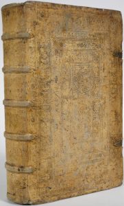 [ Geneva], oliva Rob. Stephani, 1553 (excudebat Robertus Stephanus in sua officina, anno 1554. Cal. Jan.). 2 parts in 1 vol. in-f° : 340, 308 lvs (lvs slightly yellowed or browned, foxing, mainly in the margins, stains, marginal dampstains, 7 lvs of "N" misnumbered). Contemporary binding : pigskin on wooden boards, beveled blind stamped boards with fillets, fleurons, roll-stamps (ornemental, portraits of the four Evangelists and the Christ), upper board with the name of Calepinus and the date 1558, blind decorated ribbed spine, clasps (rubbed, wormholes, small stains, scratches on lower board, edges and corners dulled, handwritten notes on upper pastedown). Bilingual dictionary (Latin-Greek) with definitions in Latin of which the princeps (Reggio, 1502) originally was drawn up by Calepino (1435-1511) in one single language (Latin). Often reprinted during the 16th Century (18 editions between 1542 and 1592 by Aldi alone) and gradually extended with equivalents in other languages culminating in the Basel edition of 1590 with no less than 11 languages (Polish, Hungarian, English, etc.). Text printed on 2 columns with a large device of Robert Estienne (olive tree) on the title-page and large dotted initials.