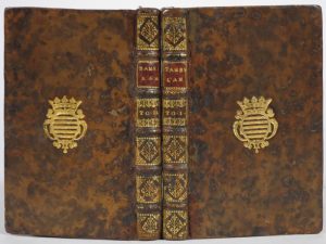 Paris, Claude Barbin, 1675. 2 vol. in-12° : [12]-190, 188 pp. (qqs petits manques de papier, qqs pet. rousseurs ou pâles pet. mouill. marg.). Rel. armoriée de l'époque : plein veau marbré, armoiries dorées sur les plats, dos fleuronnés dorés, roul. dorée sur les coupes, tranches dorées (rel. craquelée). ÉDITION ORIGINALE RARE de cet ouvrage de la romancière huguenote La Roche-Guilhen (Rouen 1644-1710 Angleterre) parfois attribué Madame de Villedieu bien que l'épître est signée par notre auteure. La mort de son père dans l'indigence et le refus d'abjurer sa foi ont probablement provoqué son entrée en littérature mais sa recherche de mécénat auprès des femmes importantes de la Cour (cfr. la dédicace de ce roman à la protestante comtesse de Quintin) est restée vaine. Ses premiers romans historiques et traductions, parus à Paris chez Barbin, sont profondément marqués par l'instabilité de cette fin de siècle, comme en témoigne son ouvrage le plus marquant, l'"Histoire des favorites" (Amsterdam, 1697).