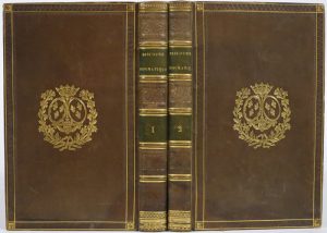 Paris, Méquignon fils aîné, 1818. 2 vol. in-8°. Rel. armoriée par Duplanil : plein veau glacé brun-beige, armoiries dorées cernées de filets dorés et roul. ornées à froid, dos à nerfs perlés dorés et caissons fleuronnés à froid avec étiq. de cuir vert, roul. ornées dorées sur les coupes et remplis, tranches dorées (lég. frottée, lég. us.). Seconde édition (éd. orig. : Bourg, Janinet, 1815).