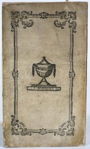 À Amsterdam, 1786. In-24° agenda : 32 pp. (pli aux coins de plusieurs pp.). Broché, sous couv. illustrée (lég. salie, pet. déchirures au dos). RARISSIME CATALOGUE DE PARFUMEUR avec types, noms et prix des eaux florales simples, composées, pots pourris, elixirs (dont eau de Cologne, sel de vinaigre, Pepermunt, sucre d'orge...), eaux pour se soigner, pour la cuisine (eau de rose, huile, olives de Provence, câpres, anchois de Marseille, morilles, moutardes, vinaigres parfumés...), pour la toilette (vinaigres pour les dents, les rides, les boutons... avec notices d'utilisation), sirops, liqueurs (dont crème de chocolat, anisette des Indes, ratafias), fruits confits à l'eau-de-vie ou au vinaigre, opiats, pommades (à la graisse d'ours pour les cheveux), poudres à poudrer, à parfumer les appartements ou les personnes, peignes (corne, écaille, ivoire, buis), savonnettes....