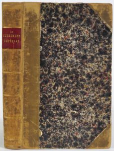 Paris, Gustave Barba, 1854. In-8° (qqs rouss.). Rel. de l'époque : demi-veau kaki à coins, plats de papier marbré cernés d'une roul. à froid, dos lisse à étiq. de cuir rouge foncé (rel. fort frottée, coins et coupes émoussés, charnières int. fendues). ÉDITION EN PARTIE ORIGINALE (200 nouvelles recettes, pp. 1-50), sous-titrée "Encyclopédie culinaire", contenant une notice sur les vins par Pierrhugues, une note sur la distribution des vins par ordre de service par M. Grignon, une table du marché saisonnier, des menus et une table alphabétique. Première édition à reprendre le titre de "cuisinier impérial", après avoir été déjà "impérial" (éd. orig. : 1806) puis "royal" (1817), "national" (1852), "impérial" à nouveau (1854) et à nouveau "national" (1875). Édition dont le nom de Viard est orthographié avec un "t", et avec les noms de Fouret (apparu en 1820) et celui de Délan (1831). Complet des 13 pleines pages montrant des plans de table.