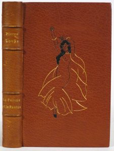 Paris, Mercure de France, (20 juin) 1898. In-8°. Relié par R. Devauchelle : plein maroquin lavallière, plat sup. orné d'une Espagnole à demi nue dansant le flamenco (filets noirs et dorés, maroq. noir pour la chevelure et le soulier), dos à nerfs, doublures de reps beige cerné d'une large bordure de même maroq. et d'un listel de maroq. noir, gardes même reps, doubles gardes de papier marbré dans les tons, tranches dorées, couv. (salie surtout au plat inf.) et dos cons. (dos de la rel. passé). Sous étui bordé. ÉDITION ORIGINALE de ce roman d'amour passionné et violent, conduit par une femme fatale pour qui l'homme est un pantin. Tirage à 609 ex. num. (+ 20 non signalés pour la "Société des XX"), un des 550 sur alfa (n° 340).