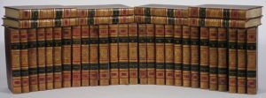 Paris, [t. 1-61 :] Librairie universelle de P. Mongie [- [t. 62-97 :] Delangle frères, Marius Amyot] (imprimerie de Jules Didot aîné), 1828 [- 1834]. 97 vol. in-8° (n.c., état moyen, certains cahiers ou vol. brunis à fort brunis - vol. 75 entièrement bruni -, rouss. +/- grandes et +/- concentrées, piqûres passim). Rel. à l'époque par Bonfils : demi-veau glacé framboise, dos fleuronnés dorés ou à froid avec deux nerfs plats soulignés de filets dorés ou à froid et des étiq. de cuir noir, plats de papier marbré rouge et noir (dos passés, coin sup. du plat sup. abîmé au t. 23, qqs pet. défauts, pet. traces blanches sur qqs coins sup. de plats sup. sinon état convenable). Édition non répertoriée par Brunet ni Vicaire, basée (?) sur celle de Paris, Dalibon-Delangle, 1824-1832 qui "[...], trop volumineuse, est sans contredit une des plus belles et des plus complètes des oeuvres du philosophe de Ferney" (# Brunet V-1357) malgré des remarques et notes pas toujours à la hauteur. Contient : Biographie (1 vol.), Mémoires (1 vol.), Théâtre (10 vol.), La Henriade (1 vol.), Facéties (1 vol.), Poésies (4 vol.), Essai sur les moeurs (6 vol.), Siècle de Louis XIV (3 vol.), Siècle de Louis XV (2 vol.), Charles XII (1 vol.), Histoire de Russie (1 vol.), Annales de l'empire (2 vol.), Histoire du Parlement (1 vol.), Mélanges historiques (3 vol.), Politiques et législation (3 vol.), Physique (2 vol.), Philosophie (6 vol.), Dialogues (2 vol.), Dictionnaire philosophique (8 vol.), Romans (2 vol.), La Pucelle (1 vol.), Mélanges littéraires (3 vol.), Commentaires (3 vol.), Correspondance (28 vol.), Tables (2 vol.).