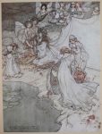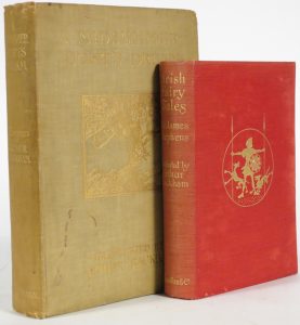 SHAKESPEARE, William.- A midsummer night's dream. London, William Heinemann; New York, Doubleday, Page, (1914), in-4° beige gilt decorated cloth (browned, stains on the cloth). With 40 colour plates protected with captioned tissue gards, black full-pages, in texto, vignettes and head-pieces, title-page with black decorations and title in gilt; ex libris Isabel Ball (Clare college bridge. Cambridge).-- STEPHENS, James.- Irish tales. London, MacMillan, 1924, in-8° red gilt decorated cloth (spine faded, white stains). With 16 colour plates, black title-page, in texto and head-pieces; label of the bookshop Laurencier.