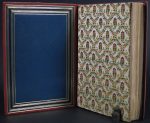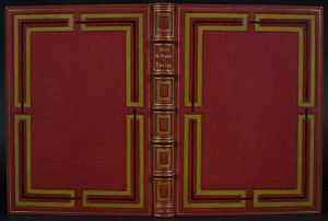 Paris, Société des Amis des Livres, 1912 (achevé le 15 décembre 1911). Gr. in-8°. Relié par Noulhac en 1912 : plein maroquin rouge sang-de-boeuf, plats sertis d'un filet doré, de filets gras et minces à froid et de larges listels de maroq. moutarde aux angles, dos à nerfs et caissons ornés dans le style des plats, double filet doré sur les coupes, doublures de maroq. bleu col-de-canard serti d'un listel de maroq. noir, de multiples filets dorés et de maroq. rouge sang-de-boeuf, gardes de papier broché dans les tons ivoire, orange et vert, doubles gardes de papier marbré, tranches dorées, couv. et dos cons. Sous étui bordé. ÉDITION ORIGINALE illustrée de 35 eaux-fortes en noir de Paillard tirées par Eugène Delatre : 4 bandeaux, 27 in texto et 4 culs-de-lampe. Texte avec ornements gravés sur bois dans le texte, lettrines et un bandeau. Les bois et cuivres ont été détruits. Tirage unique à 100 ex. num. sur vélin d'Arches réservés aux sociétaires (+ qqs-uns mis dans le commerce, cfr. Mahé III-239) (n° 91 pour Théodore Révillon). La liste des membres de la Société est donnée in fine.