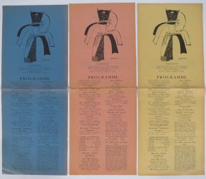- AFFICHE : 65,5 x 25 cm, orné dans la partie sup. d'un "Projet de costume pour le Bal" par Natalia Gontcharova. TROIS ÉPREUVES en noir sur papier rose (bords lég. passés, très pet. déchirures), bleu (id.) et jaune,