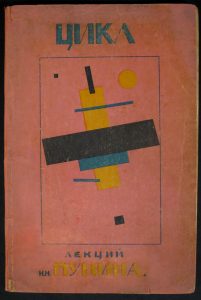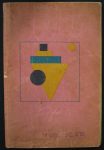 COUVERTURE en papier rose illustrée par Malevitch et une de ses rares illustrations en couleur. Deux compositions clichées tirées en bleu, jaune et noir sur les plats sup. et inf.