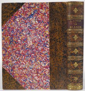 Grenoble, Typographie et lithographie Joseph Allier, 1883. Gr. in-4° : xviii (dont f.blanc et front.)-[2]-493-[2] pp. Rel. de l'époque : demi-basane brune à coins, dos fleuronné doré à nerfs, tête dorée (mors frottés). ÉDITION ORIGINALE tirée à 500 exemplaires, un des 287 souscrits (n° 116, pour le libraire Perrin). Richement illustré de 673 blasons dessinés par l'auteur et chromolithographiés in texto ou à pleine page, ce livre présente le vocabulaire et les règles de l'art héraldique. Index analytique, tables de noms de familles, errata et liste des souscripteurs in fine.