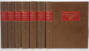 Paris, Frankelve; Paris-Nancy, Berger Levrault, ( 1975). 7 vol. in-4° (dont 1 vol. de suppl.); ill. Rel. d'édition : pleine rexine brune, plats sup. et dos lisses avec cartouches de rexine rouge titrés dorés (ex-libris armoriés). Réimpression de l'édition de 1934-1952 de cet ouvrage recherché et toujours consulté malgré certaines erreurs. Illustré de très nombreux blasons in texto (qqs-uns rehaussés) et de 8 en couleurs hors texte.