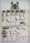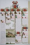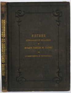 Gand, [Imprimerie et] Chromolithographie E. & S. Gyselynck, [ 1841-1874]. Gr. in-f° (58 x 42 cm) : titre, [2]-42, 4, 14, 12, 27-[1], x pp.; 25 (sur 27) h.-t. (inc. des pl. 1 et 8 des Borluut, rouss. +/- fortes concentrées). Rel. d'édition : demi-chagrin noir, plats de percaline chagrinée noire cernés de filets ornés à froid, plat sup. titré, dos lisse titré, gardes de papier moiré blanc (rel. frottée, coins à nu, coupes et coiffes émoussés...). ÉDITION ORIGINALE DE LUXE parue en plusieurs livraisons (certains ff. sont tirés sur papier vélin ou vergé) mais restée inachevée. Illustrée de grandes planches généalogiques enluminées tirées d'après les dessins de l'auteur. Consacré aux familles Borluut (8 -sur 10- pl.), Helias d'Huddeghem (2), della Faille (5), de Neve (3), Kevyn (7). Tables in fine.