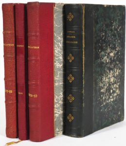 GOETHALS, F.V.; HUYTTENS, J.- Indicateur nobiliaire de France, de Belgique, de Hollande, d'Allemagne, d'Espagne, d'Italie et d'Angleterre. P., Bachelin-Deflorenne, 1869, in-8° demi-chagrin vert (fortes us. à la rel. dont plats fort frottés, dos décollé, mors sup. part. fendu...). Ex-libris "Bibliotheca Elseghemensis".-- L'indicateur généalogique, héraldique et biographique [...]. Questions et réponses concernant l'histoire des familles. Brux., Rossignol & Van den Bril, janv. 1911 [- juin 1914]. 3 vol. in-8° demi-maroq. rouge à coins (2 vol.) ou bradel demi-perc. prune à coins par G. Bonnarens (qqs pet. us.). Revue complète, avec les suppléments, illustrée de qqs pleines pp., in texto et h.-t.