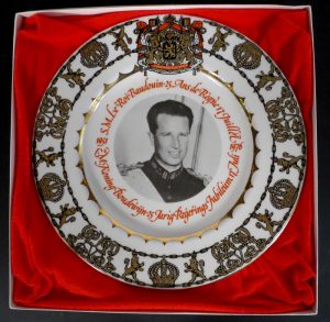 Céramique, diam. : 27 cm, portrait photographique cerné d'un banderole rouge ("1951-1976. S.M. Le Roi Baudouin. 25 Ans de Règne 17 juillet. Z.M. Koning Boudewijn. 25 Jarig Regerings Jubileum"), pourtour orné en or et noir des armoiries de la Belgique, du Leo Belgicus, de couronnes et du chiffre de Baudouin. Sous boîte, assiette protégée de tissu rouge.