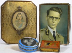 Formats divers (bonne condition générale). - BOITES : Par CÔTE d'OR (3, c. 1935) : Astrid,- le petit prince de Liège, futur Albert II,- Joséphine-Charlotte, Baudouin, et Albert enfants.-- Par DELACRE (2, c. 2000) : Albert II et Paola.-- Par PAREIN (2, c. 1960) : Baudouin I âgé d'une 20aine d'années,- Albert prince de Liège et sa jeune épouse Paola.-- Par Crosse & Blackwell Toffees & Caramels (1, c. 1935) : Léopold Ier avec ses jeunes enfants.-- Par LECOCQ, Bruxelles (1) : Joséphine-Charlotte, Baudouin et Albert enfants.-- Par DBF (1, c. 1950) : princesse Joséphine-Charlotte.-- Coffret métallique commémorant le mariage de Baudouin et Fabiola, le 15 décembre 1960 (sans la clé).