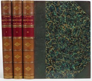 Bruxelles, Bruylant-Christophe, [fin 19e s.]. 3 vol. gr. in-4°; ill. Relié par E. Hotat : demi-chagrin vert à coins, plats de papier marbré cerné d'un double filet doré, dos fleuronnés dorés à nerfs cernés de filets à froid se prolongeant sur les plats et terminés par un fleuron, t. jaspées de rouge, couv. et dos cons. (dos passés, us. aux nerfs). Sous étuis. ÉDITION ORIGINALE (?) illustrée de 10 planches en couleurs de costumes et armoiries, de plusieurs vues, plans ou planches historiées montés sur onglets, de 2 portraits sur simple page (prince Baudouin et Louis Hymans) et de nombreux in texto ou pleines pages.