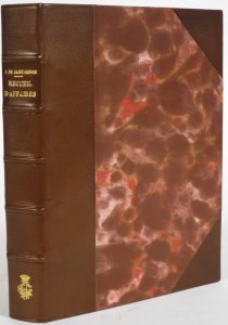Lille, de l'imprimerie de Léonard Danel, 1802. In-4° : lxviii-392 pp.; 1 tableau h.t. (piqûres passim, rares rouss., déch. restaurée au f. Bb3, ex. à belles marges). Rel. moderne : demi-chagrin brun à coins, dos à nerfs avec chiffre couronné doré, tête jaspée de rouge. RARE ET UNIQUE ÉDITION de ce recueil de lettres, requêtes et tables présentées au gouvernement autrichien en 1793-1795, concernant la famille de l'auteur et les procès qu’elle eut à subir durant cette période troublée et au-delà. Le comte de Saint-Genois de Grand-Breucq (1749-1816), issu de la noblesse ancienne du Hainaut, fut le dernier seigneur féodal de Frasnes-lez-Buissenal. Table des noms de personnes et des sujets. Complet du grand tableau dépliant hors texte.