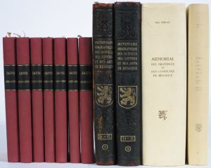 Supplément de l'Épitaphier de Nivelles, Guignardé, 1894, in-8° br. Extrait du t. IV des Annales de la Société archéologique de Nivelles.-- Jadis. Questionnaire d'histoire et d'archéologie pour tout l'ancien territoire de la Belgique féodale. Soignies, 1901 [- 1914], 8 vol. in-8° demi-toile bordeaux (lég. brunis). 16 années complètes + 3 n° br. (jan. 1897, jan. 1898, févr. 1898; 2 plats sup. déreliés, complets ?).-- DE SEYN, Eug.- Dictionnaire biogr. des sciences, des lettres et des arts en B. Brux., L'Avenir, 1935 [- 1936], 2 vol. gr. in-4° demi-chagrin noir d'éd., plats sup. décorés (pet. us. à la rel.). Ill. de reproductions photogr.; ex. signé par l'auteur.-- SERVAIS, M.- Armorial des Provinces et communes de B. [- Supplément 1955-1968]. Brux., Crédit communal de B., 1955 [- 1969], 2 vol. gr. in-4° toile beige d'éd., sous étuis. Ill. de blasons; tirage à 4.000 ex. num., 1 des 2.500 en fr. (n° 2109), suppl. tiré à 2.000 ex., un des à 1.000 en fr. (n° 502).