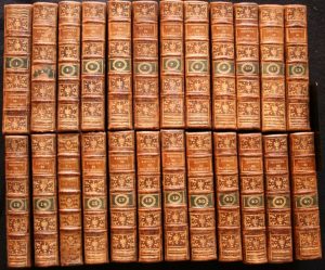 24 volumes In-12 (les tomes XXV à XXIX manquent) – In-12 plein veau brun marbré de l’époque (1 volume dans une reliure différente), dos à 5 nerfs ornés de caissons dorés, pièces de titre et de tomaison en maroquin brun et vert, quelques coiffes et coins légèrement usés, quelques feuillets écornés, incomplet des 2 derniers feuillets du tome XX - Bon ensemble décoratif