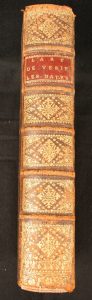 2 parties en 1 volume In-4, reliure veau granité, dos à nerfs, orné et doré, étiquette rouge, triple-filet à froid encadrant les plats, tranches rouges - Titres en noir et rouge, texte encadré d'un double filet noir – Bel exemplaire. (Brunet I, 513)