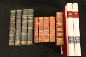 •FERRAND A. - L'Esprit de l'Histoire ou Lettres politiques et morales d'un Père à son Fils – à Turin chez , Frères Reycend, Libraires du roi – 1831-32 - 10 tomes reliés en 4 volumes In-16 sous ½ basane fauve, dos lisses ornés, pièces de titre et de tomaison en maroquin rouge, tranches mouchetées (reliures de l'époque), manque 2 étiquettes de titre – Bons exemplaires