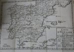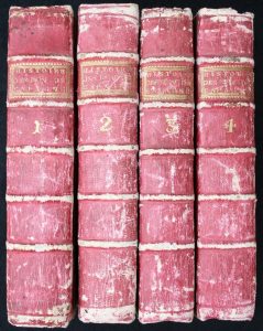 4 volumes In-12 sous ½ basane rouge, reliure de l’époque, dos à 5 nerfs, titre et tomaison dorés, papier non rogné – Vignettes de titre, carte dépliante d’Espagne par J. B. Nolin – Bon état malgré une reliure frottée