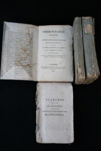 •Règlement d'Infanterie - Règlement concernant l'infanterie du premier Août 1791 – à Paris chez Magimel – 1814 - 2 volumes In-12 brochés sous reliure d'attente - Trous de vers au texte, 1 volume de texte et 1 volume de 38 planches sur 40 dépliantes (manque planche 3 et 4)
