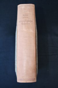 In-folio oblong sous reliure récente ½ veau marron clair à coins, dos lisse, roulettes en tête et en queue, titre et nom d'auteur, le tout à froid - 333 tableaux généalogiques typographiés intercalés dans 655 pages au total - Titre en rouge et noir, entièrement interfolié -Mouillure marginale fine en tête de certains feuillets, fins travaux de vers en marge des planches 157 jusqu'à la fin, à toutes marges – Bel état - Première partie seule, l'ouvrage sera continué jusqu'en 1733 pour offrir en tout 1133 planches. Exemplaire enrichi de nombreuses notes manuscrites soignées, et truffé de feuillets de notes et tableaux généalogiques, le tout rédigé au début du 19e siècle, d'une écriture fine et lisible. Etiquette et ex-libris