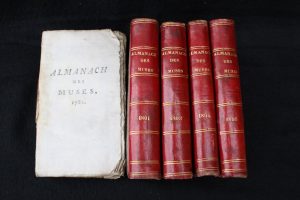 Almanach des muses pour les années 1801, 1803, 1804, 1818 – à Paris chez Louis, aux dates – 4 volumes ½ basane rouge In-12, frottements d'usage, dos lisses à filets, papier bleuté pour les 3 premières années, beau frontispice pour l'année 1808 gravé par Marillier et Delvaux, ex libris original HG – Bons exemplaires pour cette parution intéressante