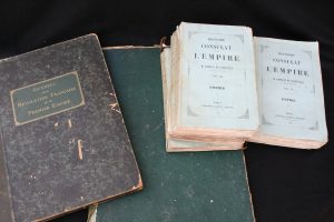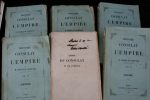 •LACRETELLE Ch. - Histoire du Consulat et de l'Empire – à Paris chez Amyot – 1846-1848 - 6 volumes In-8 brochés, non rognés - Édition originale, Envoi autographe de l'auteur : L'auteur à M. de Champvans, tribut d'amitié. Jean-Chrysogone Guigue de Champvans (1818-1900) fut secrétaire de Lamartine, et dirigea pour lui à Mâcon son journal Le Bien Public. Il fut élu député de l'Ain en 1848-1849 ; il fut ensuite préfet du Gard (1871-1876), puis inspecteur des enfants assistés de la Seine. Manque le premier plat de la couverture du tome I – État satisfaisant