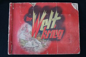 Album In-4 oblong complet des vignettes autocollantes des scènes et épisodes de la 1re Guerre Mondiale – Couverture en mauvais état mais bel état intérieur