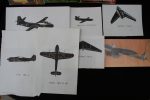 •6 dessins manuscrits d'avion : Northrop YB 49 / Gotha P.60 A / Douglas Skystreak / MESS – 109 K 14 / F.W. 190 A / North AME AJ-1 + 1 reproduction d'avion sur support cartonné