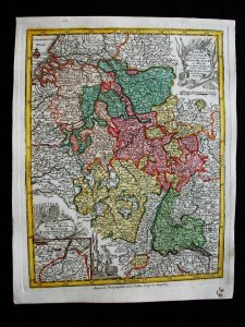 CARTE GEOGRAPHIQUE - XVIISEUTTER - Carte géographique colorisée – Martis Area et Alea per Tractum Rheni Mosellae ac Mosae – 1750 – 28,5 x 22,5 cm – Carte sous encadrement moderne – Carte du cours de la Moselle et du Rhin avec une belle...