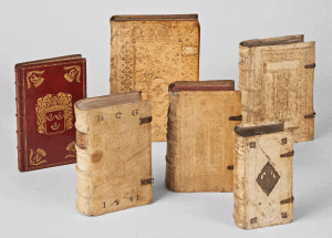 In-8, peau de truie sur ais, plats entièrement estampé à froid avec double encadrement au filet et fleurons divers entre les filets, dos à 3 doubles nerfs, traces de fermoirs.