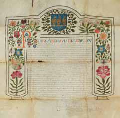de Léberon. Manuscrit enluminé sur parchemin, le texte écrit aux encres noire et or placé dans un très bel et large encadrement polychrome de feuillages, papillons et fleurs stylisés surmonté des armoiries de l’impétrant, Valence, 20 juin 1617. Petits trous aux plis, sinon pièce très décorative.
