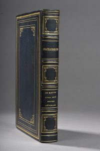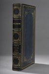 In-8°, veau bleu glacé, sextuple filet doré encadrant les plats, fleuron doré aux angles intérieurs, dos à nerfs orné de caissons, tranches dorées, gardes de moire blanche (reliure de l’ époque).