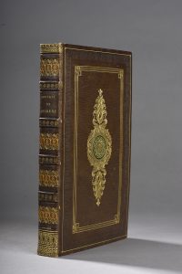 In-8°, maroquin brun à grain long, large encadrement de filets dorés et roulette estampée à froid ornant les plats, large fleuron mosaïqué de