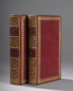 2 volumes petit in-12, maroquin rouge à grain long, filets et fine roulette dentelée dorés encadrant les plats, dos à nerfs orné, tranches dorées, gardes de moire violette (Rel. p. Bozérian Jeune).