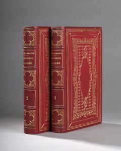 2 volumes in-8°, maroquin rouge, large décor doré ornant les plats, dos à nerfs orné, tranches dorées (reliure de l’ époque)