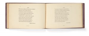 Petit in-8 oblong (135 x 208 mm) de 54 pp. et (1) f. : veau parme, dos lisse, décor géométrique de filets à froid sur les plats, bordure intérieure rehaussée d’un listel doré et de courts filets à froid, couvertures imprimées en noir et rouge conservées, tête dorée (reliure des années 1930).