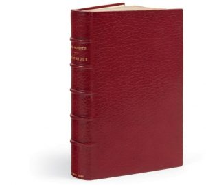 dos à nerfs, coupes filetées or, doublures de maroquin havane serties d’une bande de maroquin rouge et de filets dorés, gardes de soie rouge, tranches dorées, étui (Chambolle-Duru).