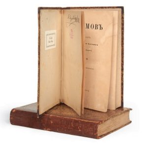 4 parties en 2 volumes in-8 (206 x 135 mm) de (2) ff. [sur 3 ; le faux titre manque], pp. [7]-260 ; 236 pp. ; 157 pp. ; 210 pp. : demi-basane fauve à petits coins, dos lisses filetés à froid (reliure russe de l’époque).