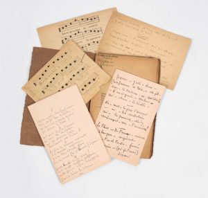 On joint trois feuillets autographes relatifs à la pièce, ainsi que deux feuillets de musique notée (plain-chant), l’un autographe, l’autre imprimé.