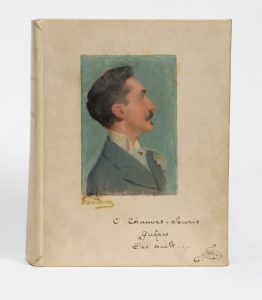 In-4 (248 x 190 mm) de (2) ff. le premier blanc, 626 pp., (3) ff. : vélin ivoire à la Bradel à petits recouvrements, dos lisse avec titre, portrait peint de Montesquiou signé “Gandara” sur le premier plat avec, en-dessous, trois vers autographes signés :