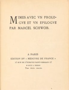 SCHWOB, Marcel. Mimes avec un prologue et un épilogue. Paris, Édition du «Mercure de France», 1894.