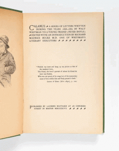 [WHITMAN, Walt.] Calamus. A Series of Letters Written During the Years 1868-1880 to a Young Friend (Peter Doyle). Edited with an Introduction by Richard Maurice Bucke M.D. One of Whitman’s Literary Executors. Boston, Laurens Maynard, 1897.