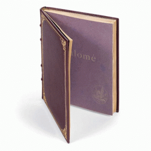 Les couvertures mauves imprimées en argent, fragiles et presque toujours décolorées, sont ici bien conservées. L’apôtre de l’esthétisme avait exigé un ton “pourpre tyrien” qui s’harmonisât à la chevelure dorée d’Alfred Douglas : “Bosie is very gilt-haired and I have bound Salomé in purple to suit him.”