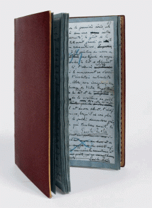Manuscrit autographe signé in-8 (222 x 148 mm) de (53) ff. sur papier bleu clair montés sur des feuillets de papier bleu foncé : maroquin tabac janséniste, dos lisse, coupes filetées or, bordures intérieures décorées (M. Lortic).