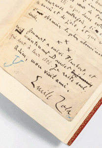 Manuscrit autographe signé “Émile Zola” in-4 (223 x 175 mm) de 12 pages paginées 1-11 et (1) p. plus courte, montées sur onglets et interfoliés : maroquin janséniste rouge, dos à nerfs, filets sur les coupes, dentelle et roulette intérieures, tranches dorées, étui (Semet & Plumelle).