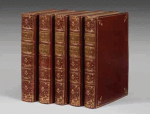RELIURES DE L'ÉPOQUE. Maroquin rouge, fleurons aux angles, encadrement de filets dorés, dos à nerfs ornés, doublures et gardes de papier dominoté, tranches dorées